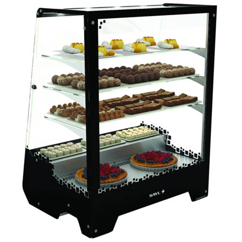 Vetrina refrigerata VENTILATA da appoggio, totalmente costruita in cristallo temperato. Realizzata con solida costruzione in acciaio inox e cristallo temperato, facciata frontale in vetro camera (doppio vetro). 3 mensole regolabili in cristallo (di serie) e 5 livelli di esposizione. Sistema di illuminazione di ultima generazione a LED, luce fredda e minimo consumo. Ideale per l’esposizione di antipasti, stuzzichini, sandwich, tramezzini ed alimenti per varie preparazioni in bar, pizzerie, paninoteche, pub, ristoranti, gastronomie e pasticcerie. Gruppo di refrigerazione incorporato e nascosto alla vista del cliente.